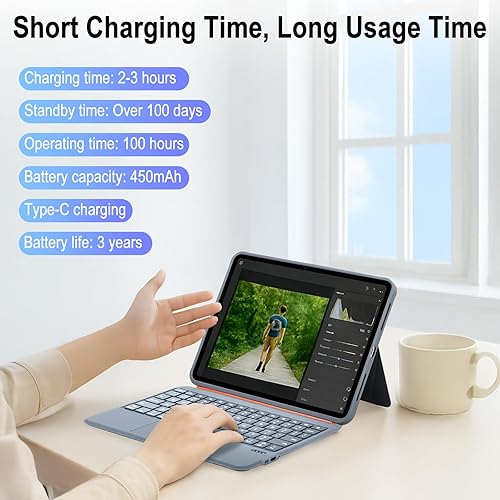 7-Color Backlit Keyboard: The iPad case 10th generation keyboard includes iOS shortcut keys and a customizable 7-color backlight with three brightness levels. Type comfortably in any environment—whether you're studying in a library, working in a café, or in a dimly lit room. The keyboard offers up to 100 hours of use with the backlight off and a remarkable 100-day standby time. Its 450mAh rechargeable battery fully charges in just 2–3 hours for long-lasting productivity.
