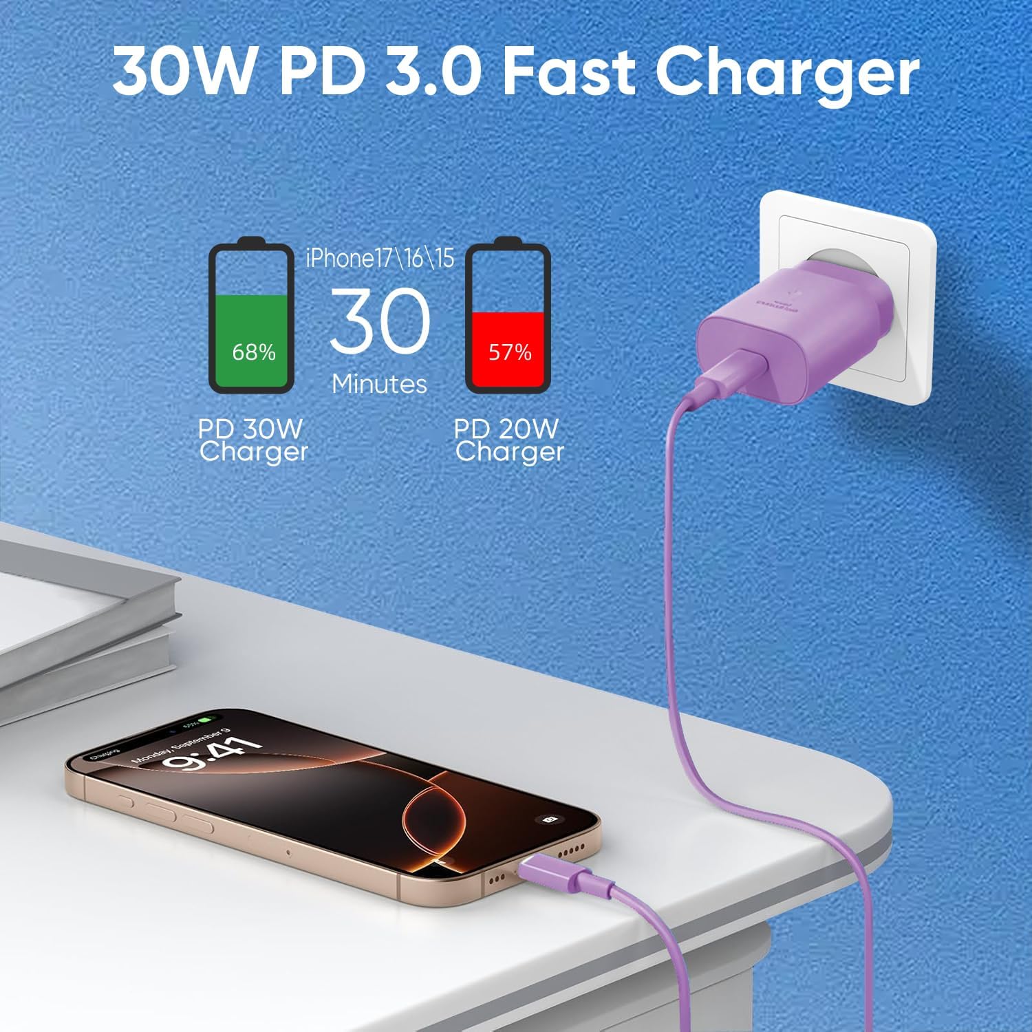 【30W Portable iPhone 17 16 15 Charger Fast Charging/iPad Pro Charger USB C】Equipped with Latest-generation, Future-proof fast charging technology, the PD 30W USB C fast charger with 10ft extra long USB C to USB C fast charging cable provide 30W Max power output, fast charge your iPhone 16 Pro Max up tp 70% in just 30 minutes, much faster than the 20W USB C iPhone charger