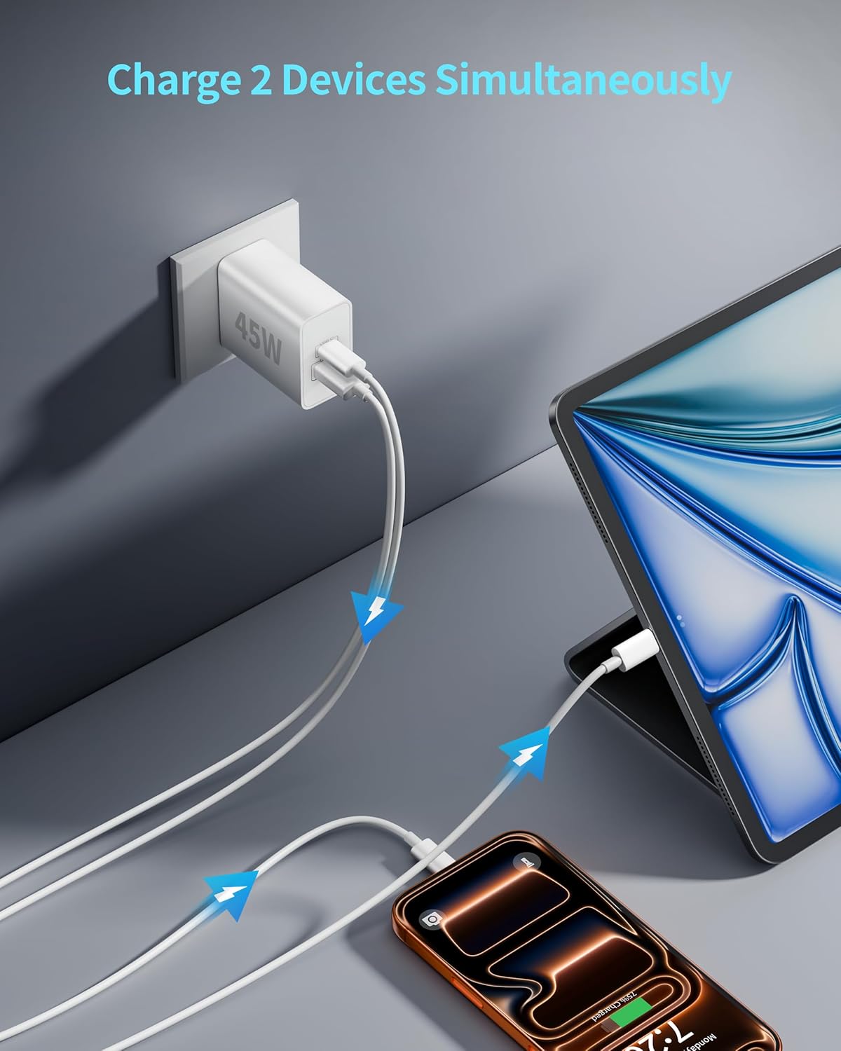 Widely Compatibility: The 45W USB C Charger block features dual ports and works with cell phone, tablet devices, compatible with iPhone 17/17 Pro/17 Pro Max/Air/16/16 Plus/16 Pro/16 Pro Max/15/15 Plus/15 Pro/15 Pro max, iPad Pro/Air/Mini, AirPods, Galaxy S25/S24/S23/S22 Ultra, Google Pixel 10/9/8/7/6 Pro XL, LG, Moto, Android, Tablets, and more
