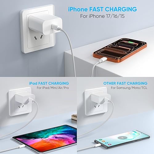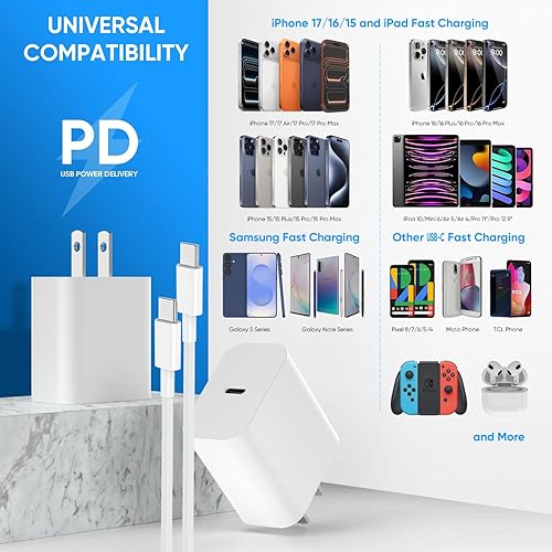 【iPhone 17/16/15 Pro Max Charger Fast Charging Compatibility】This 20W charger kit are perfectly compatible with new version iPhone 17 16 15/ iPhone 17 16e 15 Plus/ iPhone 17 16 15 Pro/ iPhone 17 16 15 Pro Max, Pro 12.9-inch, 11-inch, Air 6th/5th/4th 10.9 inch, Mini 7th 6th 8.3 inch, 10th Generation,and Samsung S25 S24 S23 S22 S21 5G / Ultra / Plus,Android and more cell iPhone.