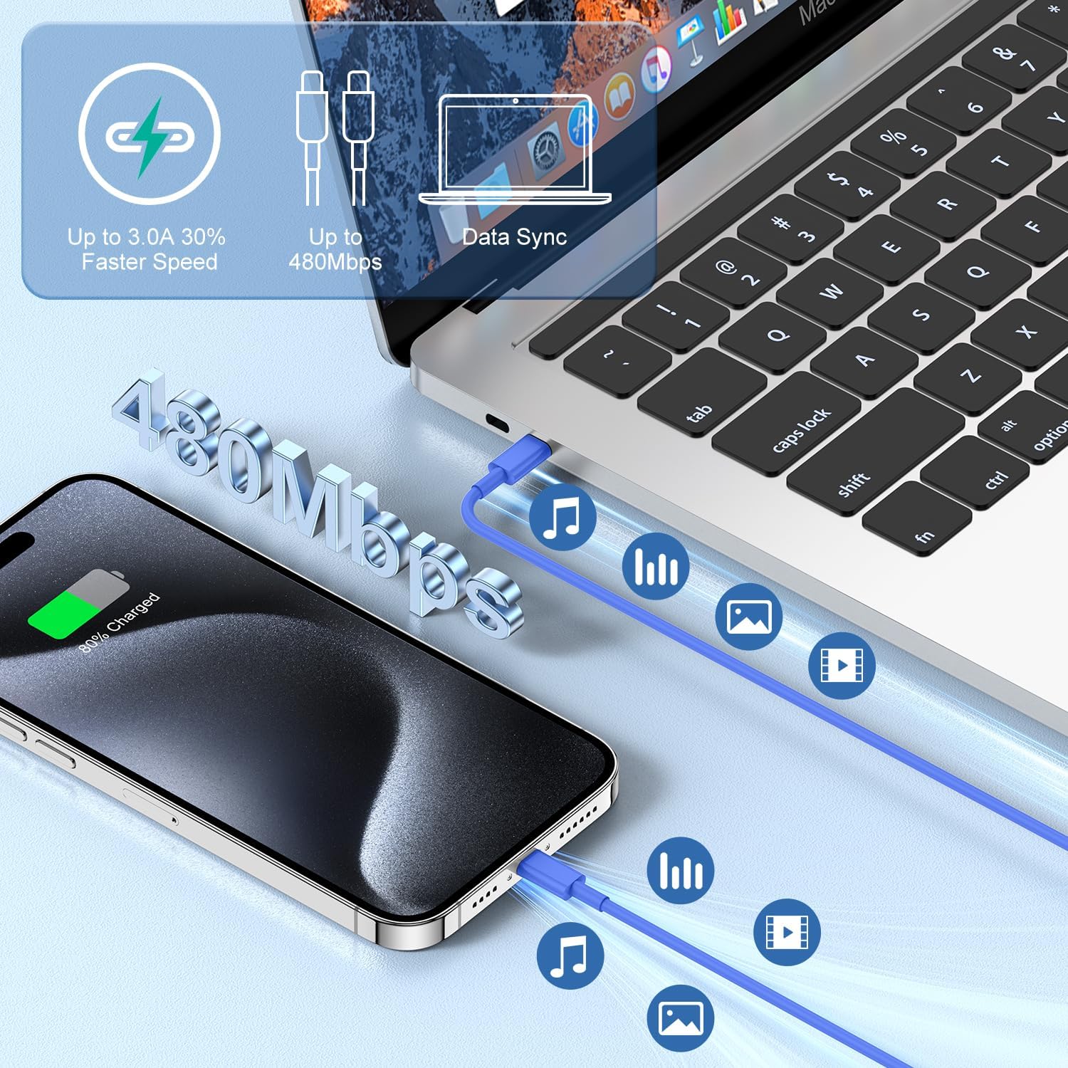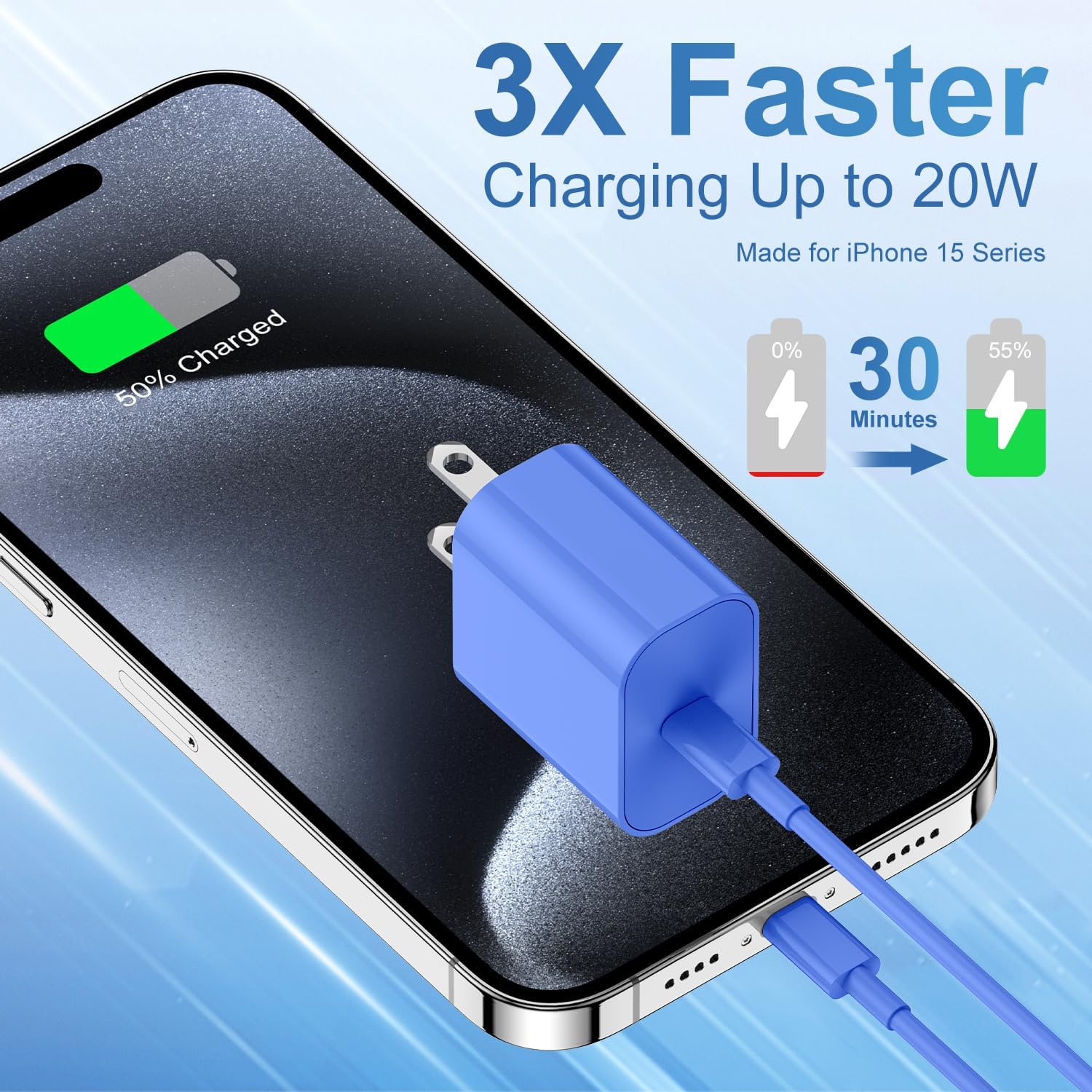 iPhone 17 16 15 Fast Charger Block and 10ft USB C to C Cable Cord Long for Apple iPhone 17 Pro Max/17 Air/16e/16 Plus/15/iPad Mini/Samsung,Type C Wall Charging Power Adapter Plug Cube Brick-Purple(Single Port-20W-Blue,10ft)