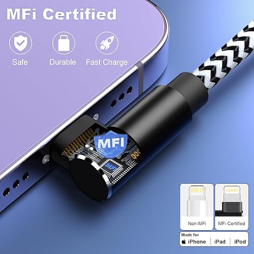 【Wide Compatibility with Flexible Charging Options】 Works seamlessly with all Lightning devices, including iPhone 14/13/12/11 Pro Max, XR, XS, 8, 7 Plus, 6S, SE, iPad Pro, Air, Mini, and iPod. Features a right angle lightning cable with a 90-degree connector that reduces strain on your cable and device port. Ideal for tight spaces, gaming, or charging while using your phone, this 90 degree iPhone charger offers versatile charging solutions.