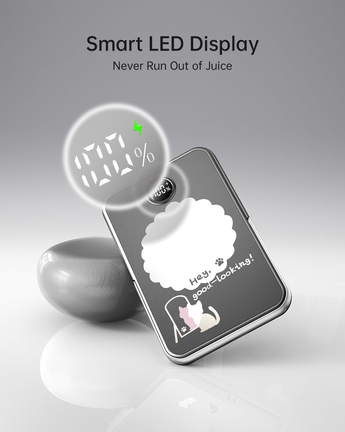【2-in-1 Magnetic Portable Charger & Mirror】Charge Your Phone & Check Your Look Anywhere – This wireless power bank features a built-in HD mirror, eliminating the need for a separate makeup mirror. It is perfect for quick touch-ups at work, the gym, or while traveling. The 5000mAh magnetic portable charger provides one full charge for the iPhone 15.