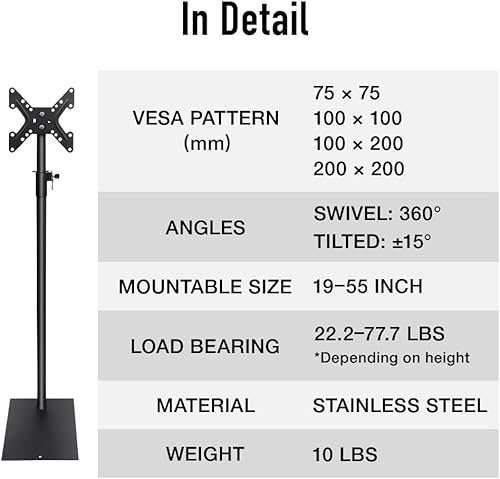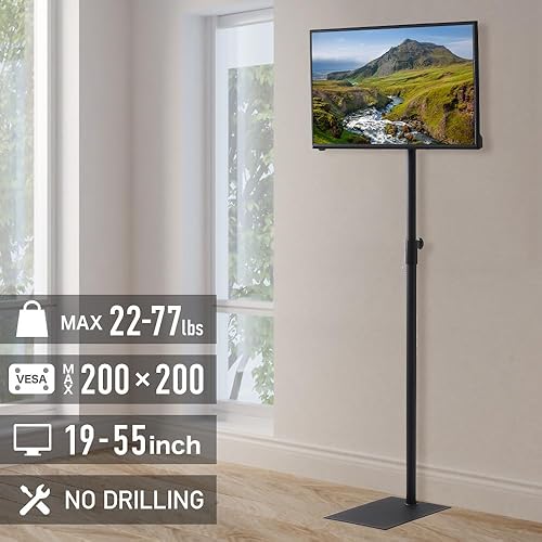 Universal Design: Skinny TV Stand for Bedroom is suitable for most 19 to 55 inch LCD LED flat panel TVs, and the VESA pattern is 3 x 3 inch, 4 x 4 inch, 4 x 7.8 inches, 7.8 x 7.8 inches / 75 x 75 mm, 100 x 100 mm, 100 x 200 mm, 200 x 200 mm and holds up to 22-77 lbs depending on the selected height between 49-74 inches and it does not require wall-mounting or purchasing expensive TV table or furniture