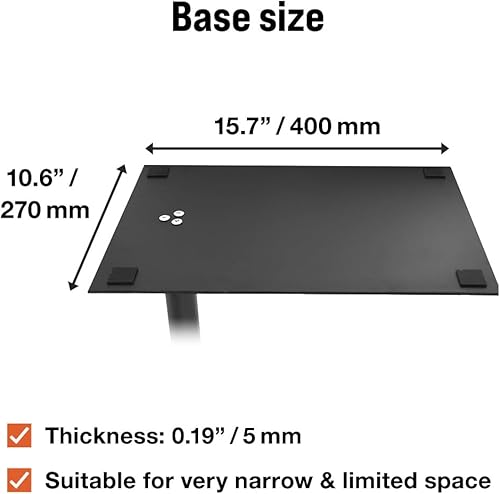 Space Saving Design with Small Base: Portable TV stand comes with 5 mm thin metal base, 10.6" x 15.7" sized base that connects to a solid steel pillar which provides stable support for your TV that creates a modern look for your audio video equipment, it can hold up to 77 lbs