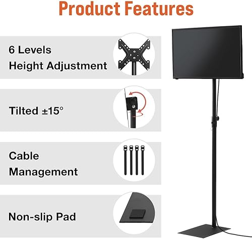 Highest Floor Mounting Stand for Monitor: TV stand has 6 levels of height adjustment, each section is 6.3 inches apart, and the height can be adjusted between 4.09 ft / 1250 mm and 6.22 ft / 1900 mm, the highest, and the flat steel base measures 15.74 x 10.62 inches / 400 x 270 mm, which weighs 100 Lbs / 4.5 kg, stable and it can endure up to 77.7 Lbs / 35 kg