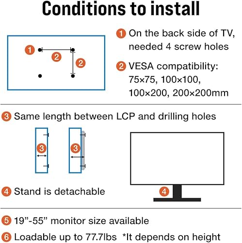 Tips for installation: Please follow the instruction guide and our TV mount stand is designed to install in simple way and before the installation, please check the size, weight, and positions of the screw hole of your TV display and also check whether all hole depth is same or not, to make it sure the compatibility with the specific stand