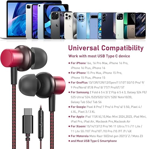 Widely Compatibility: USB C Wired Earbuds for iPhone 17 Pro Max/ 17 Plus/ 17 Pro/17, iPhone 16e/16 Pro Max/ 16 Plus/ 16 Pro/ 16/ iPhone 15, Samsung Galaxy A55/A35/A54/A53/S25/S24/S23/S22/S21/S20, Galaxy Z Flip/ Z Fold 6 5 4 3 2, Galaxy Tab S9 +/S9 Ultra/S8/S7/S6, Google Pixel Tablet/Fold, Pixel 8 Pro/7 Pro/6 Pro/6A/6/5/4/4XL/3/3 XL,for iPad 10th/Mini/iPad Air Pro M4 M2, for MacBook Pro/Air, for OnePlus 13R/13/12R/12/Open/11/10 Pro/10t/9 Pro/9/8T/8 Pro/7T Pro/7, etc w/ USB C Audio Port Device