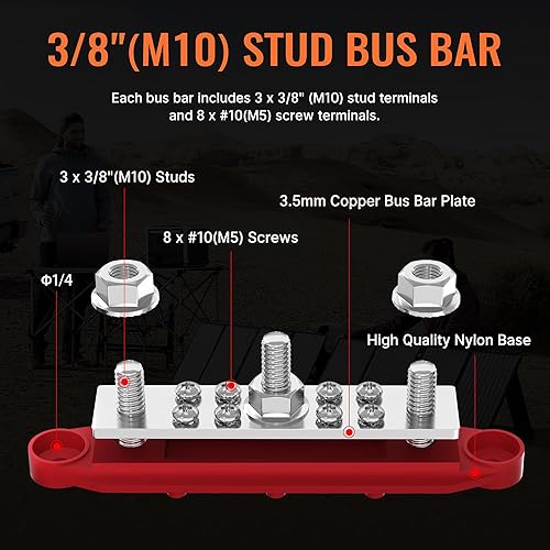 Superior Material: The 400A bus bar terminal block 12v features 8mm(0.32") thicker COPPER bus bar plate with stainless steel studs and nuts. Red Positive Busbar and Black Negative(Ground) Busbar as a pair