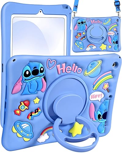 JoySolar for Samsung Galaxy Tab A7 Lite Case - Soft Silicone Cute Cartoon Tablet Case with Rotating Stand & Shoulder Strap, Shockproof Tablet case for Kids Boys Girls, Blue(Pink,for iPad 7th/8th/9th)