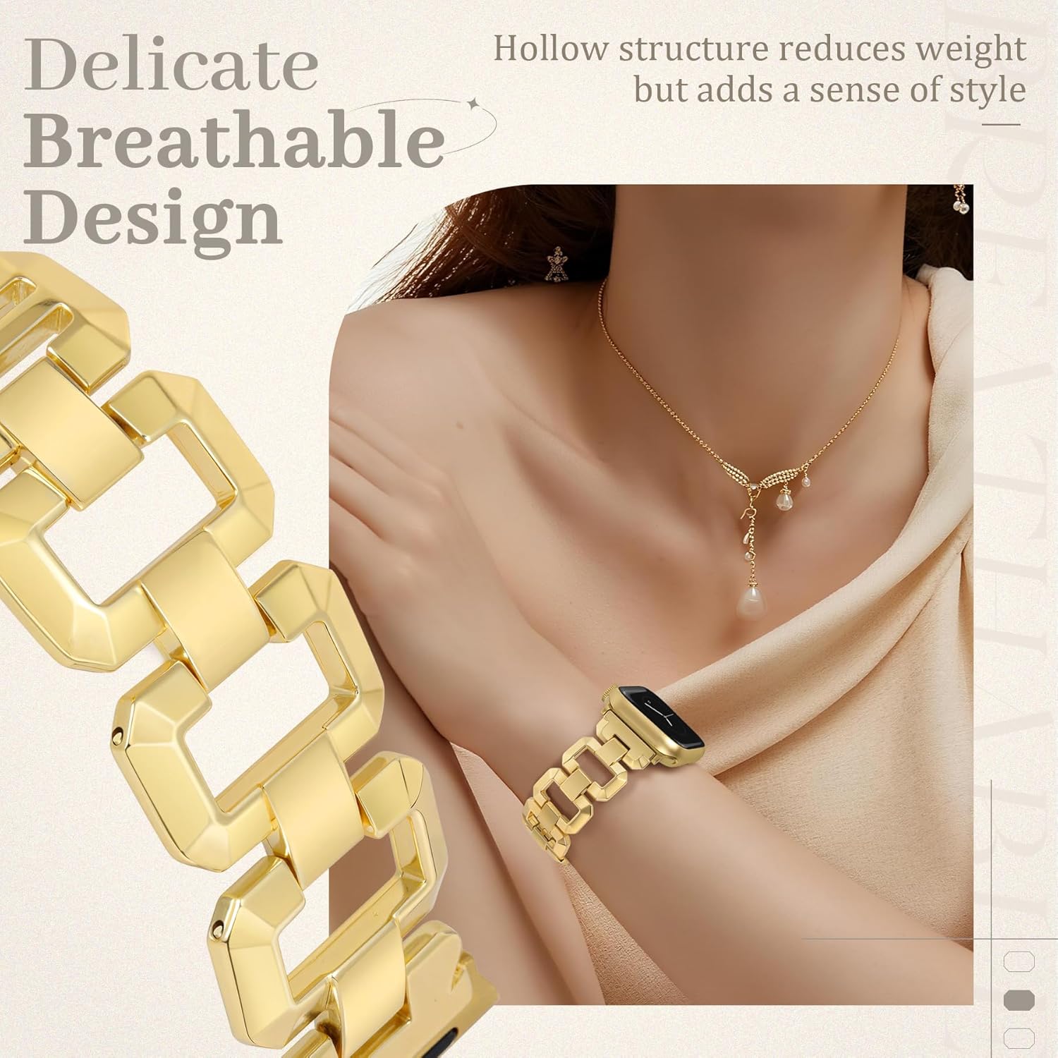 Unique Hollow Design: Upgrade your look with our eye-catching square hollow metal watch band, designed to stand out from traditional solid styles. The openwork structure creates a lighter, more breathable feel while adding a touch of modern elegance. It contours naturally to your wrist for a comfortable fit and enhances the graceful lines of your hand—perfect for showcasing your unique sense of style