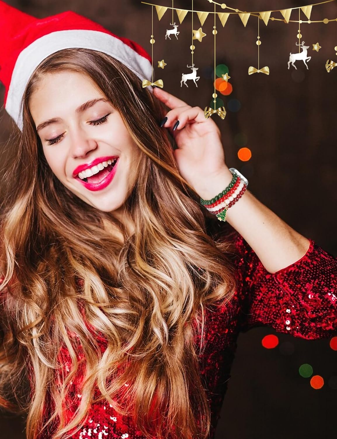 JR.DM Natural Stone Beaded Bracelet Women Compatible with Apple Watch 40mm 41mm 38mm 44mm 42mm 45mm 46mm 49mm, Comfort Cool Elastic Bands Replacement for iWatch Series 10/9/8/SE/7/6/5/4/3/2/Ultra(Christmas,38/40/41/42mm(Series 10/11))