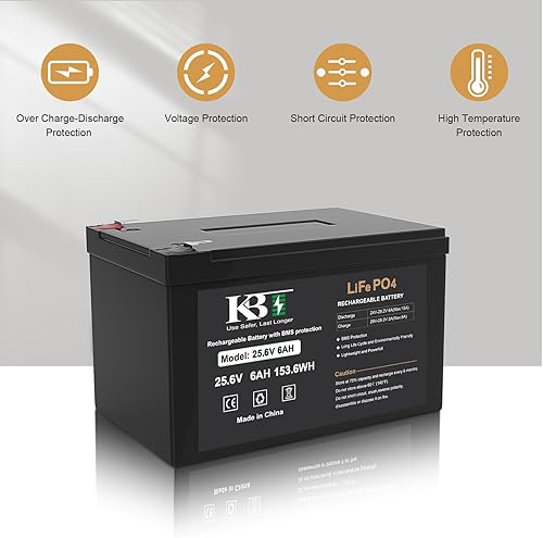 【Premium Battery Performance】: LiFePO4 Lithium battery has high energy density, light weight, long cycle life, good charge-discharge performance, no memory effect, low self-discharge rate, environment-friendly etc. This KBT 24V 6Ah battery has built-in BMS protection PCB Board to prevent battery from overcharge, over-discharge, over-current and short circuit.