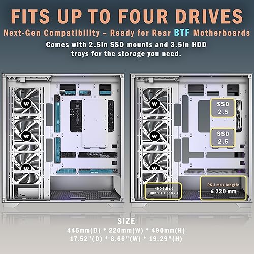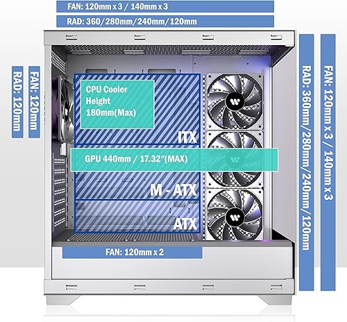 [Remarkable Expansion]-- (1)The Mid Tower Gaming Computer Case supports ATX / Micro-ATX / Mini-ITX motherboards.(2) Support 360mm Radiator (3) CPU cooler height maximum 180MM (4) GPU length maximum 440MM (5) Power supply type ATX up to 220MM (6) Equipped with HDD and SSD trays (7) Expansion PCIE-Slots 7 (8)Fits up to 9 x 120mm Case Fans and 2x simultaneous radiators.