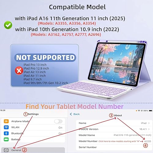 【Compatible Models】This keyboard case is compatible with iPad 11th Gen A16 2025 version (Model: A3355, A3356, A3354); with iPad 10th Gen 2022 version (Model: A3162, A2757, A2777, A2696). Note: Please check whether your for "A****" tablet model is compatible before purchasing. (Click "Settings-System-About Tablet Model")