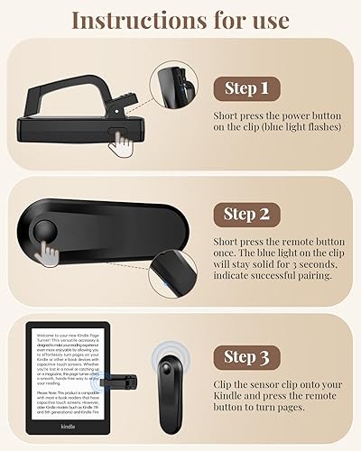 【Easy Operation for Lazy Girl】: Let you free your hands. Even if you read for a long time in bed or on the sofa, your hands won't get tired, keep a healthy posture when reading. The kindle remote page turner in bed or on the sofa, does not require a Bluetooth or WiFi connection. Press and hold the button on the receiver for 3 seconds, Then the red light is steady on, press any key of the remote control. At this time,the blue indicator light on the receiver flashes to indicate successful matching. Then clip the receiver onto the screen and you can use the remote control to flip pages freely