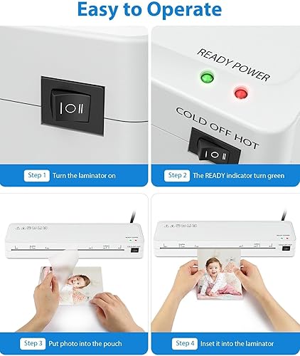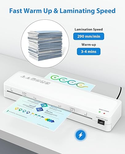 【Fast, Efficient & Quiet】The laminator machine with laminating sheets warm-up quickly within 90 seconds, and the lamination speed reaches up to 290mm/min with ultra-low noise. The laminating machine will create high quality, professional and wrinkle-free results quietly to improve your work efficiency.