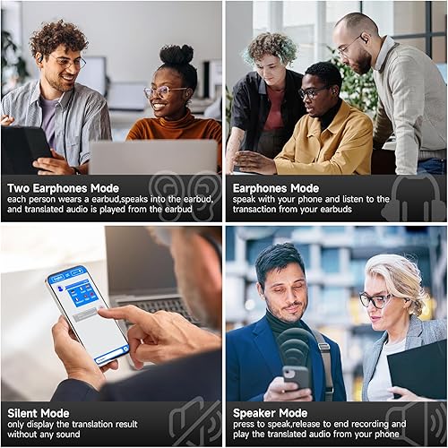 Suitable for Multi-scenario: The Bluetooth translator earbuds have 4 Translation Modes. Two earphone modes: each person wears an earbud, speaks into the earbud, and translated audio is played from the earbud; Silent Mode, only displays the translation result without any sound; Earphones mode, speak with your phone and listen to the transaction from your earbuds; Speaker Mode, press to speak, release to end recording and play the translated audio from your phone. You can easily switch the translator mode to enhance your communication efficiency in different situations.