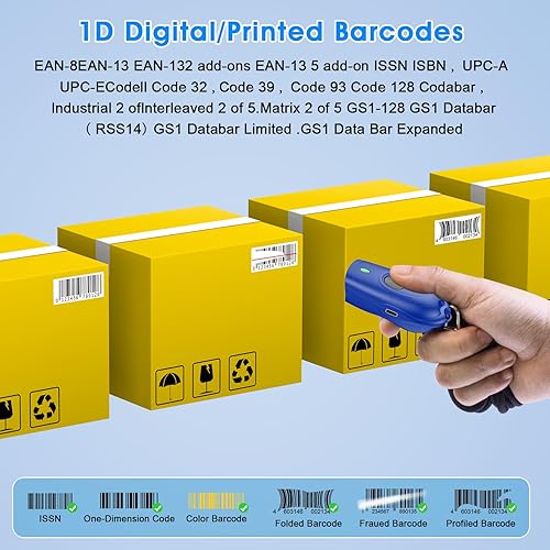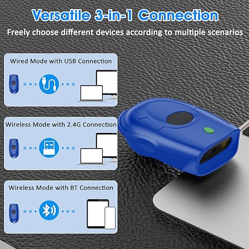 The new 1D barcode scanner features a 3-in-1 connection design: Bluetooth functionality; 2.4G wireless connection receiver; wired connection. It can be easily connected to laptops, desktops, mobile phones, tablets, iPhones, iPads, and POS terminals. Compatible with Windows XP/7/8/10, Mac OS, Windows Mobile, Android OS, and iOS systems. (Not compatible with SPP)