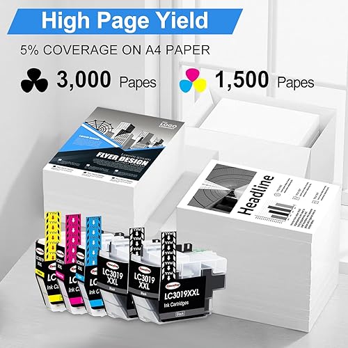 High Page Yield: Up to 3,000 pages per lc3019 XXL Black, 1,500 pages per lc 3019XXL Cyan, Magenta, Yellow at 5% coverage