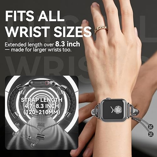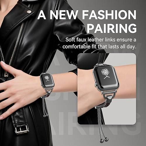 Leather and Metal Band Compatible with Apple Watch Bands for Women,Adjustable Designer Cute Stylish Strap for iWatch Series11/10/9/8/7/6/5/4/3/2/1/SE/Ultra(black black,41/40/38/42mm(Series 10/11))