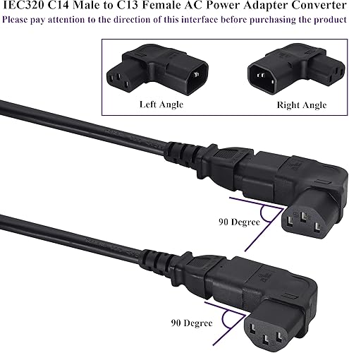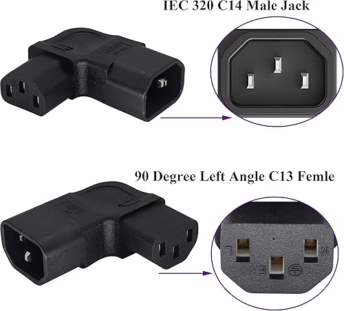 【90 Degree elbow Design】: IEC320 C14 to 90 Degree Left angle C13 Converter,Changes the angle of the existing C13 connector, The L-shaped (Left) right angle connector can be used in narrow spaces to prevent damage caused by bent power cords. (such as reaching the back of the computer,peripheral devices,and rack cabinets). Note: We have four directions for this kind of products: up, down, left and right. Be sure to check your equipment interface and interface direction before buying.