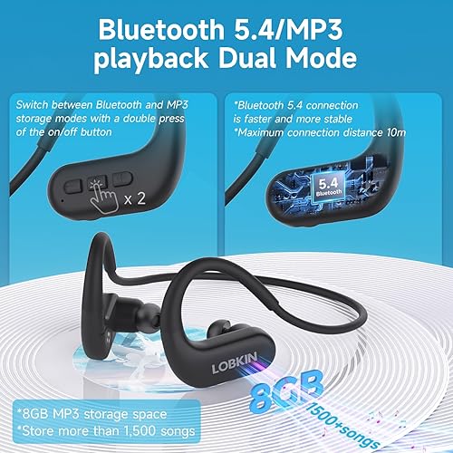 8GB Storage & Bluetooth 5.4: waterproof headphones for swimming can store 1500+ songs, and you can enjoy music without mobile phone Bluetooth connection, Support Bluetooth 5.4 and MP3 dual mode, double-click the power button to switch, (Bluetooth cannot be used when swimming, MP3 mode is a perfect solution).
