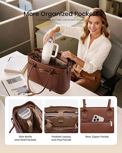 【Spacious Laptop Tote Bag】Computer bag owns 17.3" laptop pocket + one tablet sleeve (both padded), 2 interior side pockets (one sized for Stanley), 4 different wall pockets, 1 zip security pocket, plus 1 quick-grab external zip pocket. Which can easily swallow water bottles, umbrellas, notebooks, chargers, pens, and phone in dedicated homes—no more black-hole bottoms.