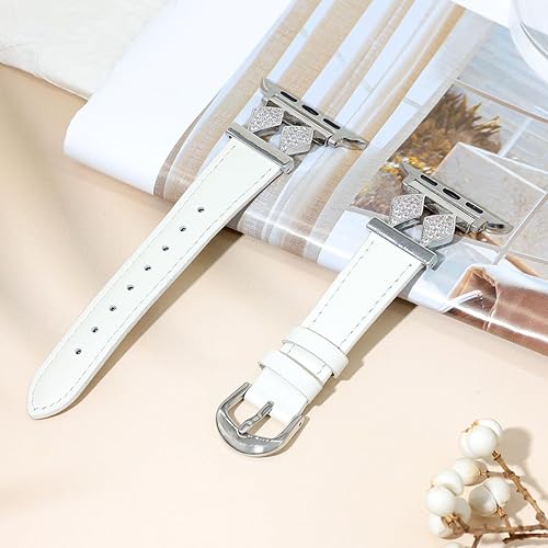 LuReen Leather Band Compatible with Apple Watch Bands 38/40/41/42mm for Women, Dressy Slim Leather Strap with Bling Diamond Interlock Buckle for iWatch Series Ultra 10/9/SE/8/7/6/5/4/3/2/1(White/Rhombus,44mm/45mm/46mm/49mm/42mm(Series 3/2/1))
