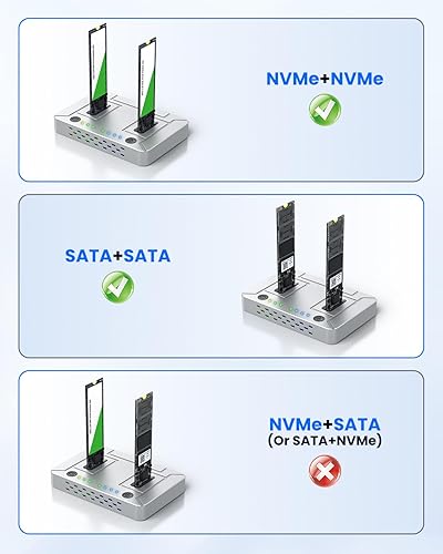 Warm Reminder: This M.2 SSD duplicator requires same-protocol drives for all operations - NVMe to NVMe or SATA to SATA; Important notice: The m.2 docking station cannot mix NVMe and SATA drives in the same operation; For successful cloning, always verify both drives use matching protocols before starting the duplication process.