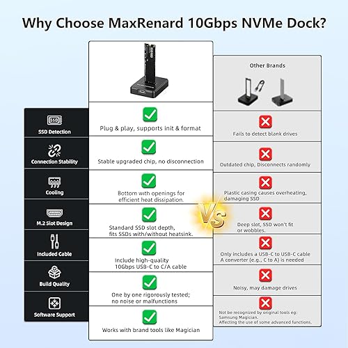 【Widely Compatible NVMe M.2 Reader】The MaxRenard M.2 NVMe SSD reader supports M Key and B+M Key interfaces, fitting full-size specifications: 2280/2260/2242/2230. It is compatible with Windows/Linux/MacOS/Android systems (Note: Not supported for SSDs with heat sinks, M.2 PCIe (AHCI) SSDs, or Mini SATA SSDs), covering diverse device needs.