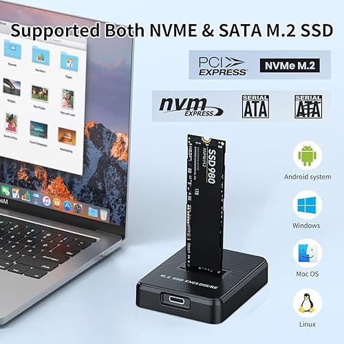 【Plug & Play Driver-Free Design】No driver installation is required. Simply insert an NVMe or M.2 SATA SSD into the dock slot, connect the USB-C cable, and start data transfer and backup immediately. It supports hot-swapping (Note: Do not replace the hard drive while connected), making it newbie-friendly for effortless switching and high-speed reading of M.2 SSDs.