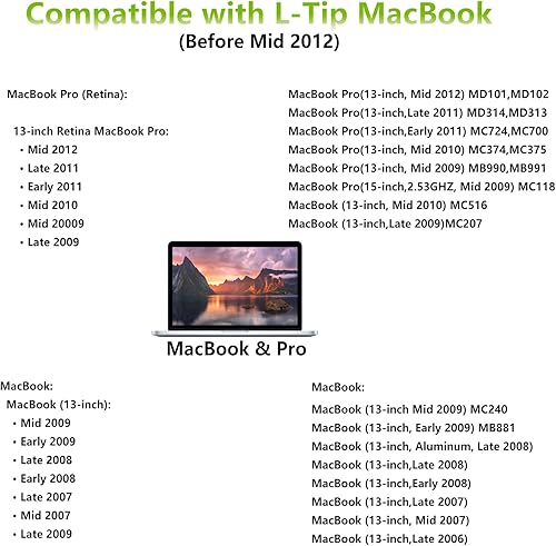 Note: Mac Book Pro Charger 60W L-Tip Mag-netic 1 before Mid 2012 Models.Not compatible with Mac Book models from late 2012 through 2017, nor with 2020-2024 Magnetic 3 T-Tip Mac Book.