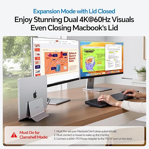 Dual 4K@60Hz Displays for Multitasking - Plug and play, connect 2 external displays via two HDMI ports of this macbook air docking station dual monitor, resolution up to 4K@60Hz, you can experience stunning visuals, elevate both productivity and viewing pleasure. Perfect Macbook Dock for multitasking, gaming, or streaming, video editor, photography, programmer, etc. ★NOTE: (1) Please connect a PD power adapter of 65w or above to the "PD IN" port when the dock is fully loaded; (2). How to achieve Clamshell Mode: 1) Pre-set your Macbook not to auto sleep; 2) Connect a mouse to dock to wake up Macbook anytime; 3) Connect a PD power adapter of 65w or above to the "PD IN" port