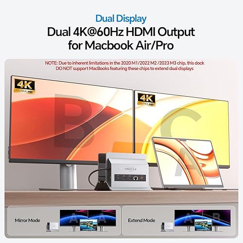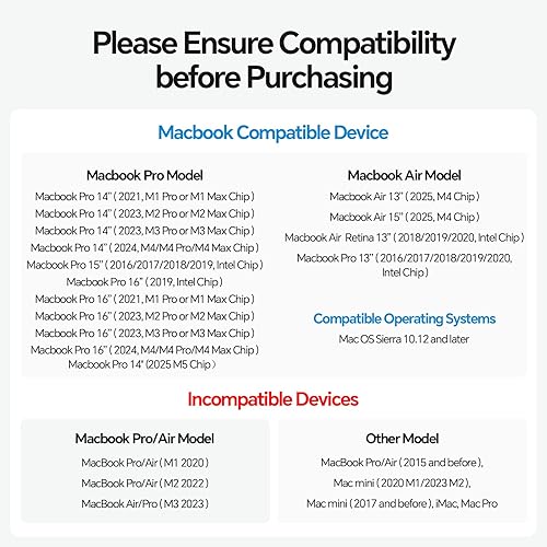 COMPATIBILITY - ONLY extend dual monitors for MacBook Pro 14''(2025 M5 Chip, 2024 M4 chip, M4 Pro or M4 Max chip, 2023 M3 Pro or M3 Max chip, 2023 M2 Pro or M2 Max chip, 2021 M1 Pro or M1 Max chip); MacBook Pro 16'', (2024 M4 chip, M4 Pro or M4 Max chip, 2023 M3 Pro or M3 Max chip, 2023 M2 Pro or M2 Max chip, 2021 M1 Pro or M1 Max chip), MacBook Air(13-inch/15-inch, 2025)M4 chip, MacBook Pro 13'' (2020,2019,2018,2017,2016 Intel). MacBook Pro 16'' (2019, Intel). MacBook Pro 15'' (2019,2018,2017,2016 Intel ), MacBook Air (Retina, 13-inch, 2020/2019/2018) Intel chip. ★NOTE: 1) NOT support dual displays with MacBooks with 2020 M1/2022 M2 /2023 M3 chip; 2) NOT for windows or other laptops