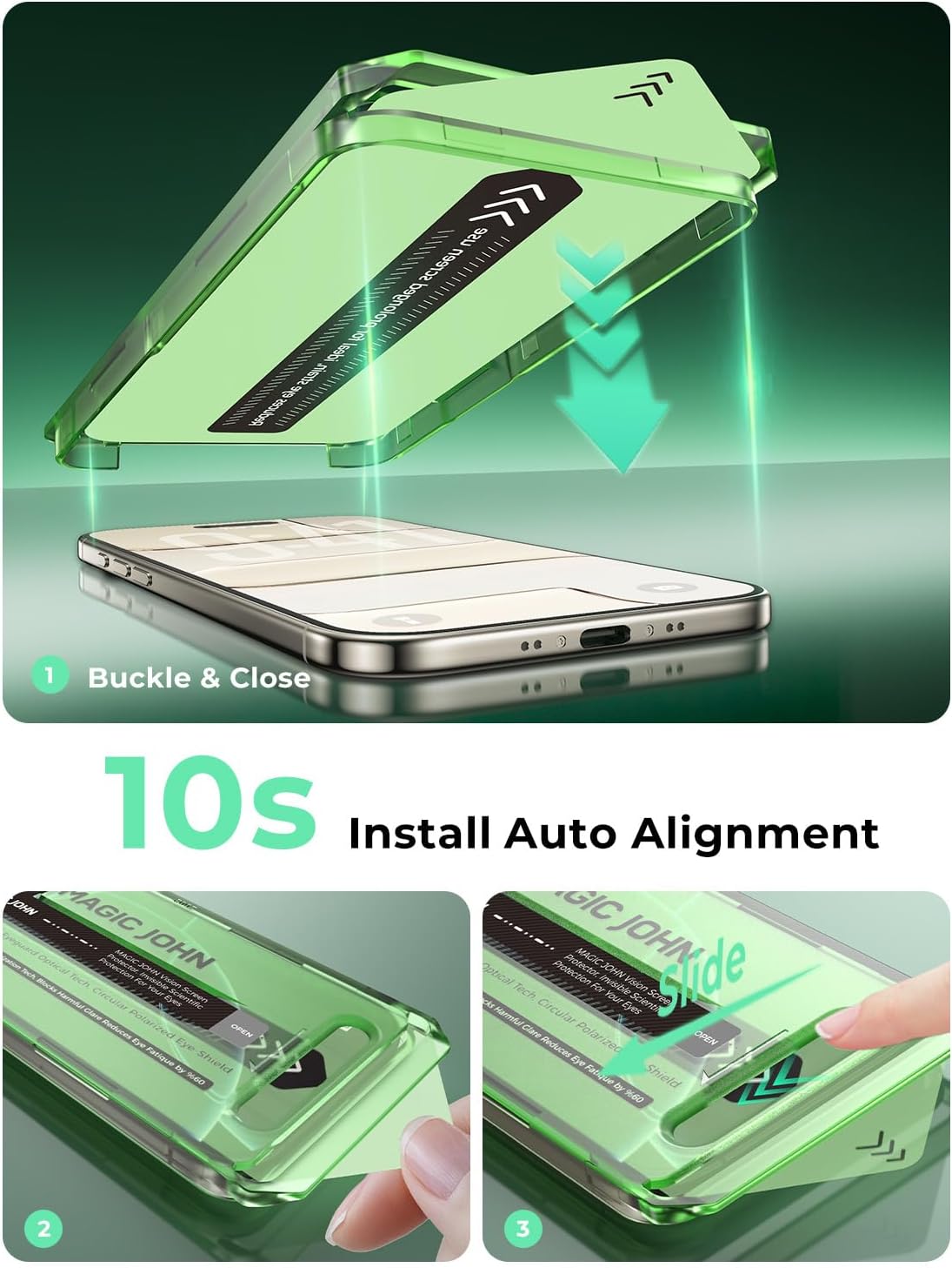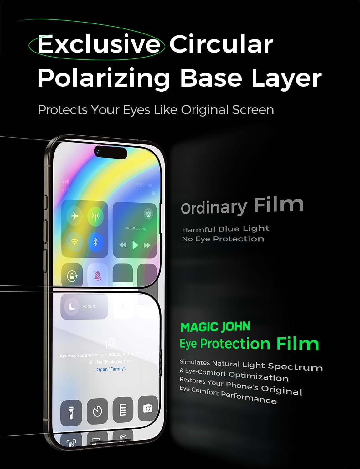 Advanced Circular Polarization Tech: Unlike other screen that emit harmful blue light, MAGIC JOHN eye protection screen protector features an exclusive circular polarization base layer, mimicking natural light just like the original iPhone screen. It neutralizes harsh glare and single-point eye strain caused by linear polarization