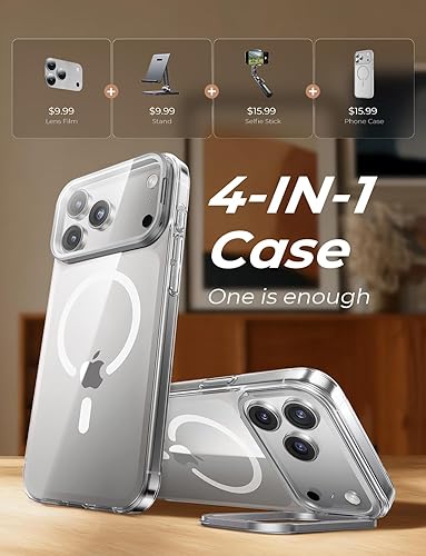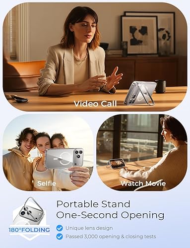 [180° Foldable Lens-Stand Case] The MAGIC JOHN iPhone 17 Pro Max case features a unique 180° foldable lens-bracket design, which can be adjusted from 0 to 180° at will, and can be used as a handheld selfie bracket to meet your needs in different situations. The alloy hinge has survived 3,000 lab-tested open-close cycles, locking solidly and never dropping. Your ideal partner for leisure, entertainment, outdoor adventures, and travel