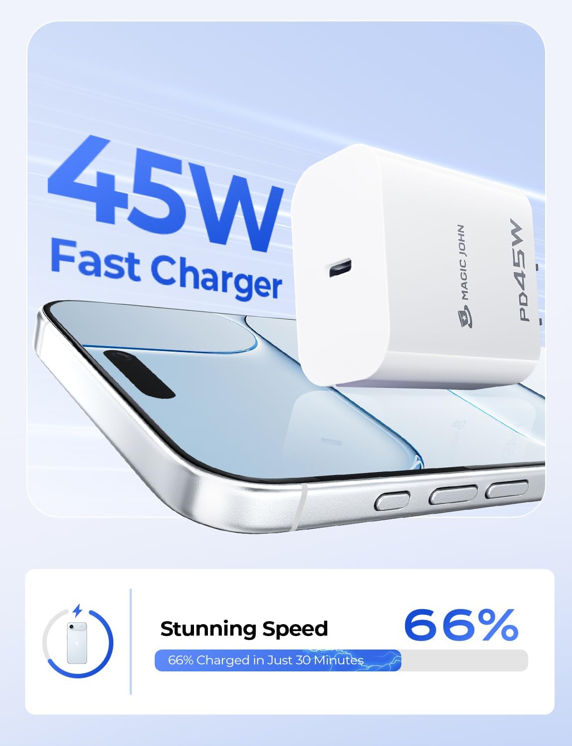 [PD 45W Fast Charger] Features triple protection against over-voltage, over-current, and overheating for safer charging. 45W high power input, 3 times faster than ordinary charging. PD3.0 fast charging, compatible with iPhone, Samsung and other mainstream models. Portable design, more convenient for travel and business