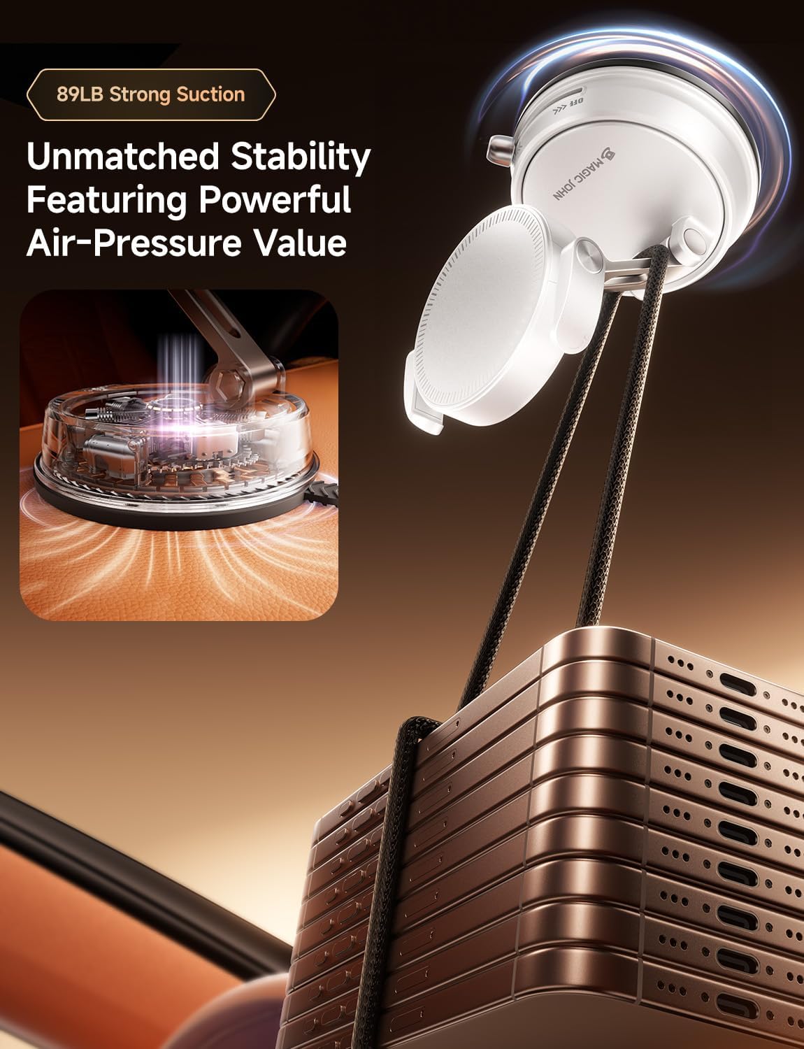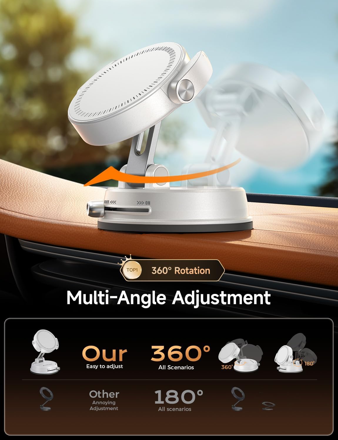 Strong Suction & Stable Hold: This car phone mount uses advanced 1-key rotating-lock vacuum suction, boosting suction by 45% compared to traditional press-on mounts. It stays stable on bumpy roads or during sudden stops. The 4-layer high-strength nano gel suction cup supports up to 89lbs and holds firm in extreme temperatures. After 10000+ durability tests and 200+ reattachments, it can be cleaned and regain 99% of its suction power for lasting stability.