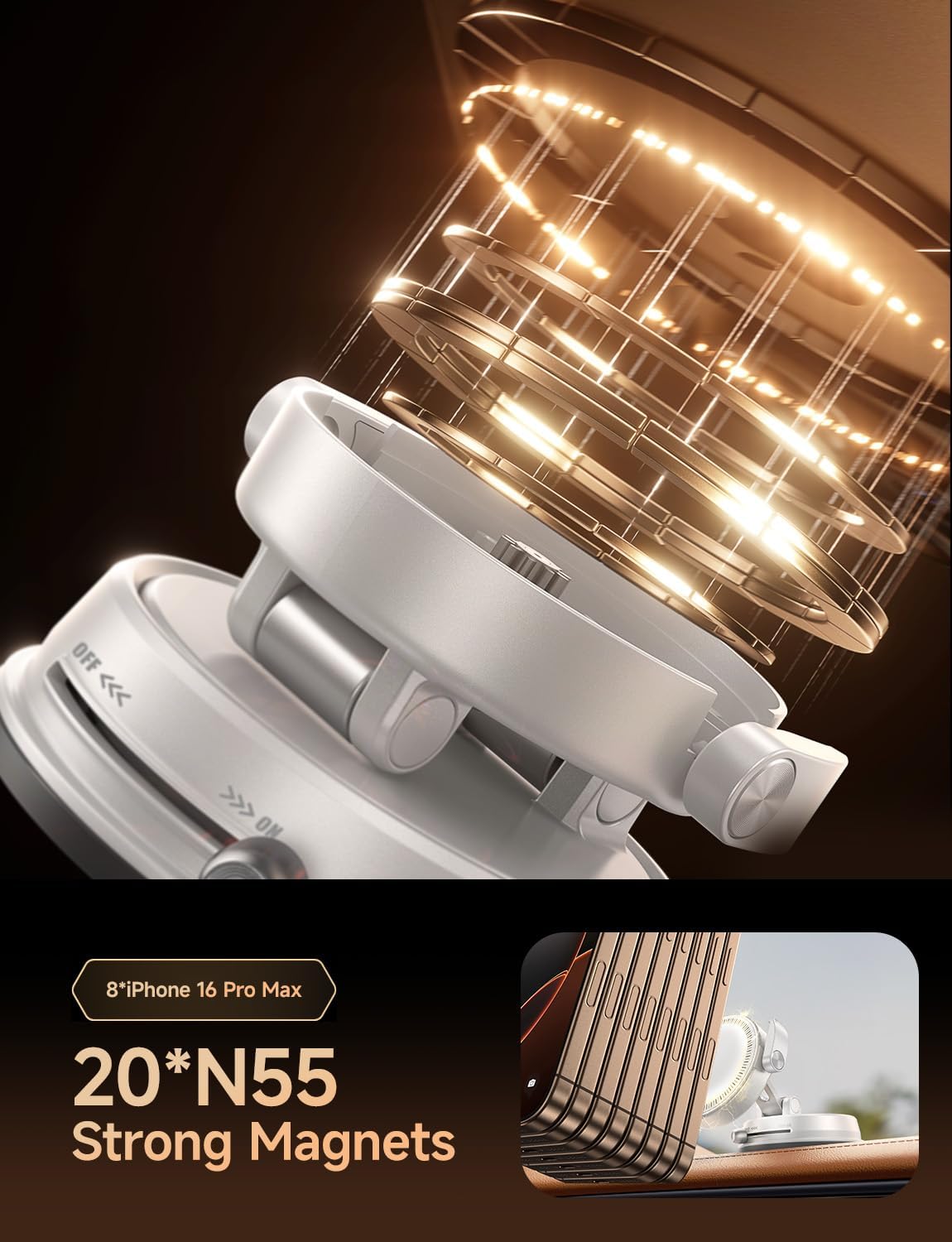 Stronger Magnetic Force: The magnetic phone holder with 20 high-performance N55 magnets, the magnetic strength is 200% stronger than standard magnets, providing a top-tier hold with up to 2400gf of force. It can support the weight of up to 50 phones. After 5000 vibration tests and extreme road simulations, your phone stays secure during bumps, sudden stops, or sharp turns. The precise magnetic design ensures strong adhesion without disrupting phone signals for clear navigation and calls.