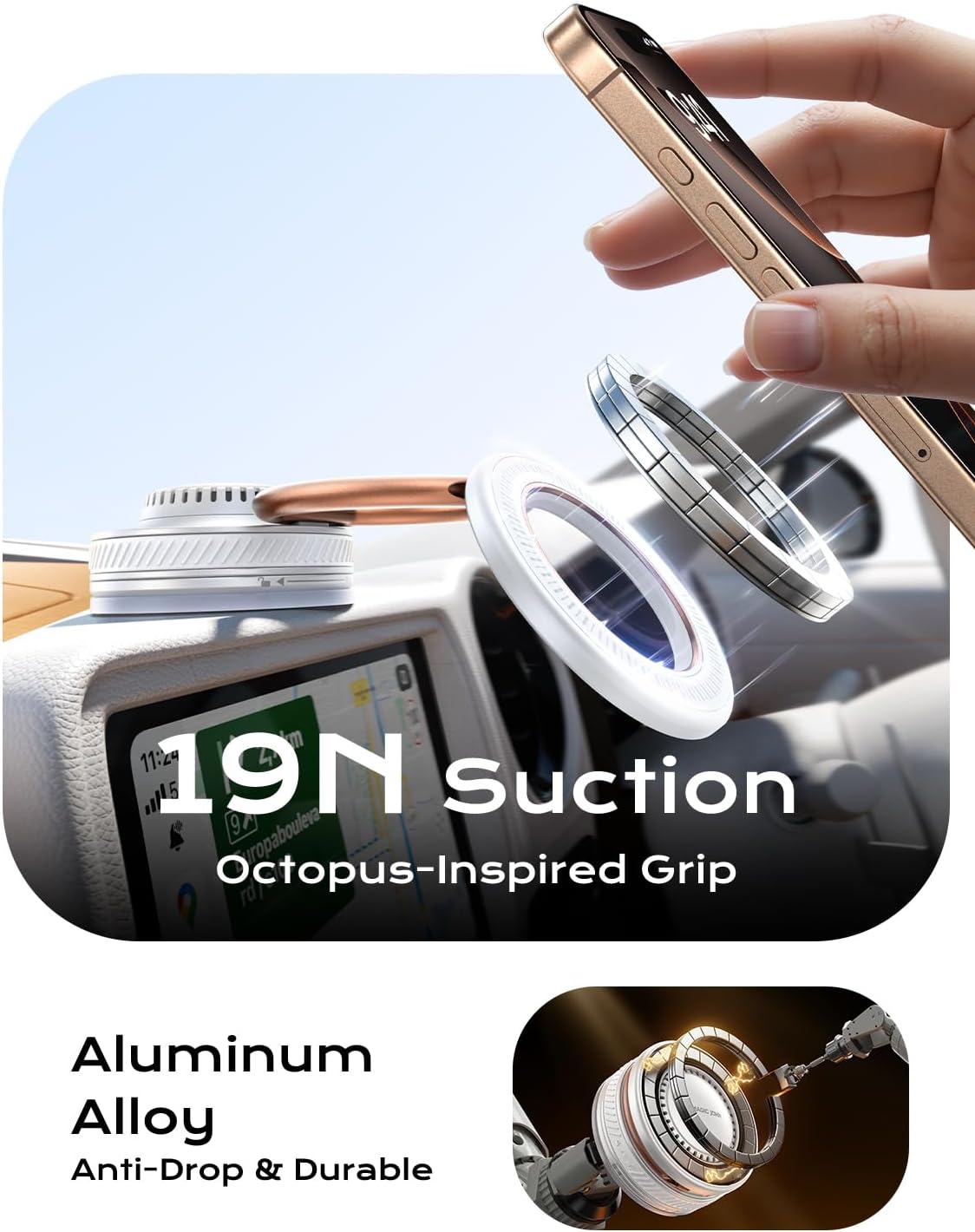 Strong Suction & Stable Hold:Equipped with upgraded silicone gel suction cup & rotating locking vacuum suction technology, it is 45% more powerful than traditional pressing suction cup and can keep stable on bumpy roads or during emergency braking. Just turn the knob to firmly fix the car phone holder on smooth or flat surfaces, such as the dashboard, windshield, center console or window. A base pad is included and suitable for leather/textured surfaces — press firmly and let it set for 5 hours before use. Ideal magnetic phone holder for your car
