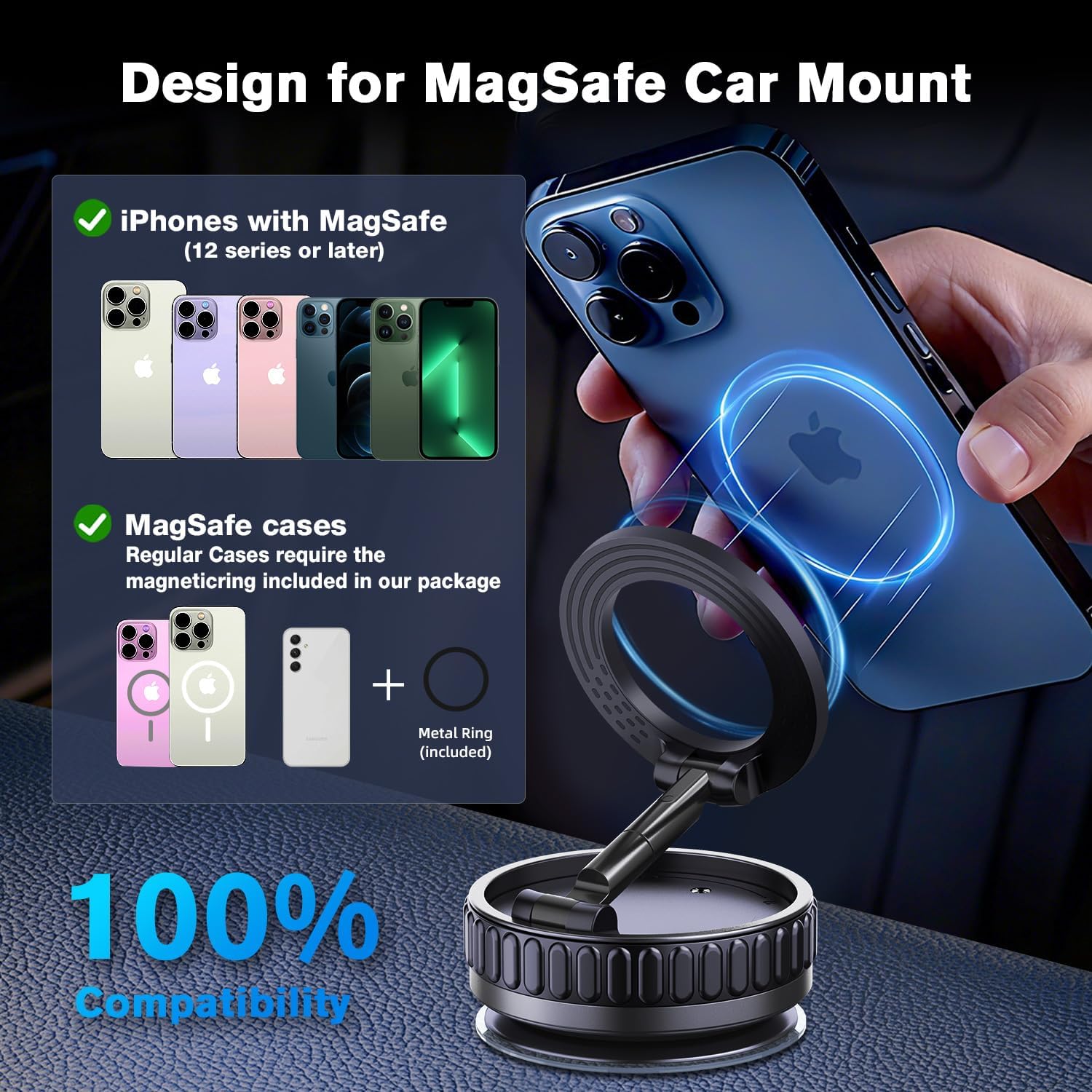 Universal Compatibility & Easy Use: Designed for all phone holders for your car needs, it works seamlessly with iPhone 12-17 series, MagSafe devices, and non-MagSafe phones via included metal rings. Install in seconds with one hand—no tools needed. As a dashboard phone holder magnetic solution, it fits all vehicle models and lifestyles, from commuting to content creation. Enjoy hassle-free phone car mount performance that keeps your device secure and accessible everywhere