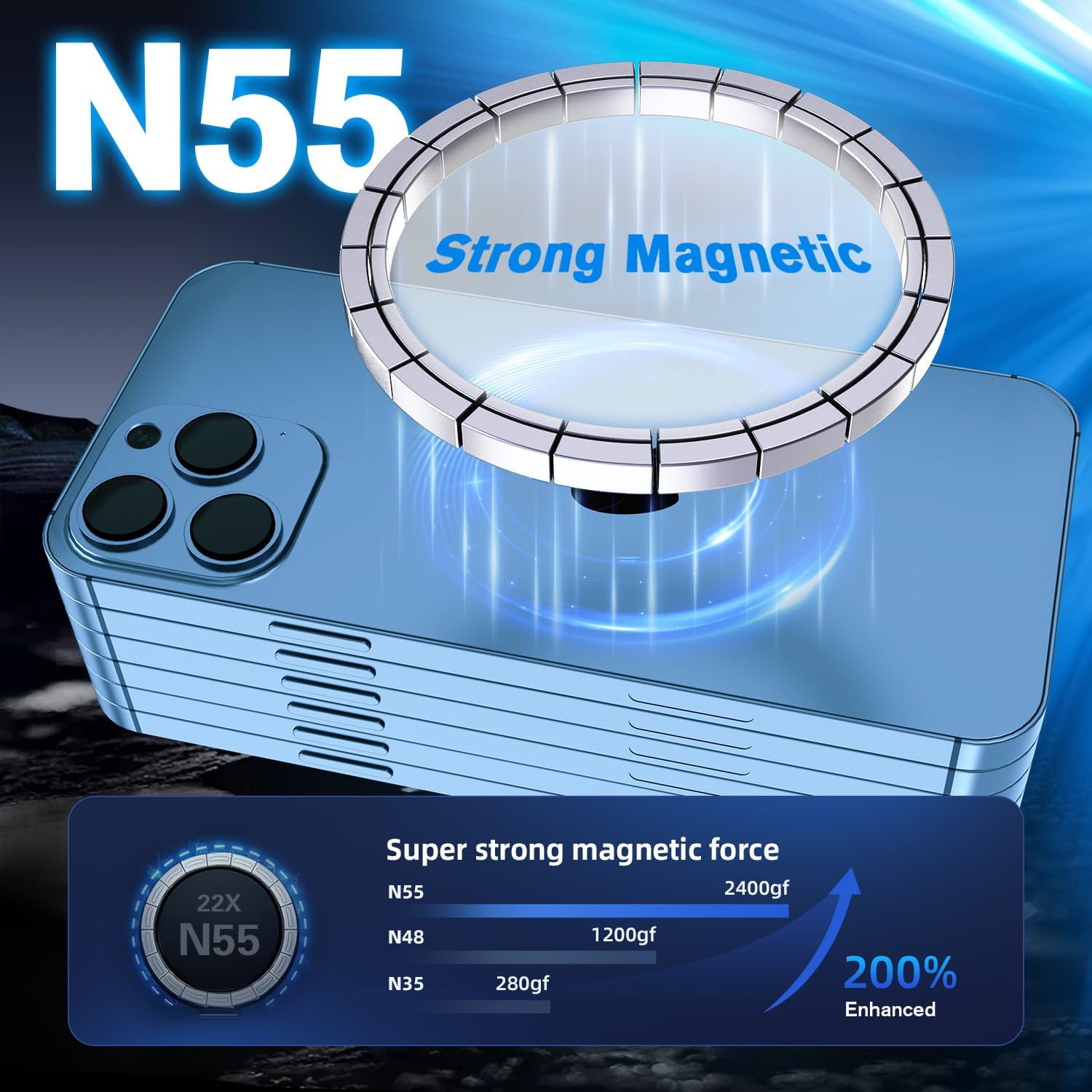 Ultra-Strong N55 Magnetic Grip:SOGUE for MagSafe car mount equipped with 40 high-performance N55 magnets,this magnetic phone holder for car delivers 200% stronger hold than standard magnets,1s grip,generating up to 2400gf of force.the magnetic car phone mount securely supports phones up to 2kg,even during sudden stops or sharp turns.The precise magnetic array prevents signal interference,ensuring clear calls and navigation.Compatible with for magsafe car mount devices and all smartphones using included metal rings,it’s a top-choice magnet phone holder for car