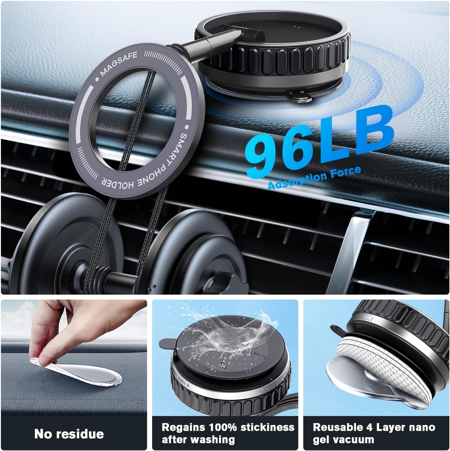 Powerful Suction Cup Technology: The SOGUE suction cup phone mount for car features a 4-layer high-strength nano gel design that creates an ultra-strong vacuum seal on any smooth surface. With 45% stronger adhesion than traditional suction mount magnetic phone holder options,it withstands extreme temperatures (-40°F to 300°F) and holds up to 96lbs.Perfect as a dashboard phone holder or for mirrors and refrigerators, it remains rock-solid on bumpy roads.Just clean the surface before use, and enjoy reusable, reliable performance for your cell phone car mount needs