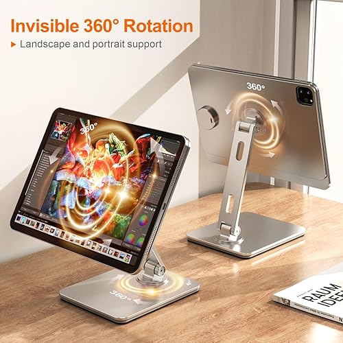 SMOOTH 360° ROTATION FOR TOTAL FLEXIBILITY: Whether you're working, sketching, or on a Zoom call, this stand gives you complete control. The base rotates a full 360°, so you can spin your screen around without lifting a finger. With adjustable hinges for height and tilt, it’s more than just a charger stand for iPad—it’s a flexible setup that adapts to whatever you’re doing.