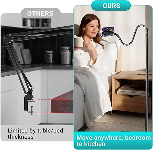 【Weighted Floor Base & No More Falls】The weighted floor stand provides rock-solid stability that won't tip over, The non-slip silicone padding will protect your floors from scratches. The gooseneck arm is bendable for any angle for watching movie in bed, hands-free recipe reading in the kitchen, or workout video viewing in your home gym. The floor stand design just place it anywhere