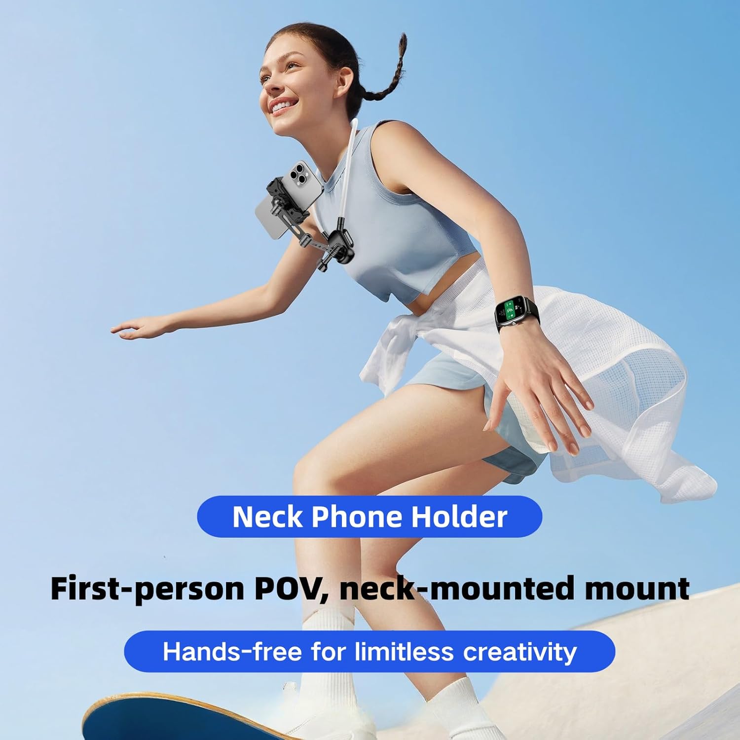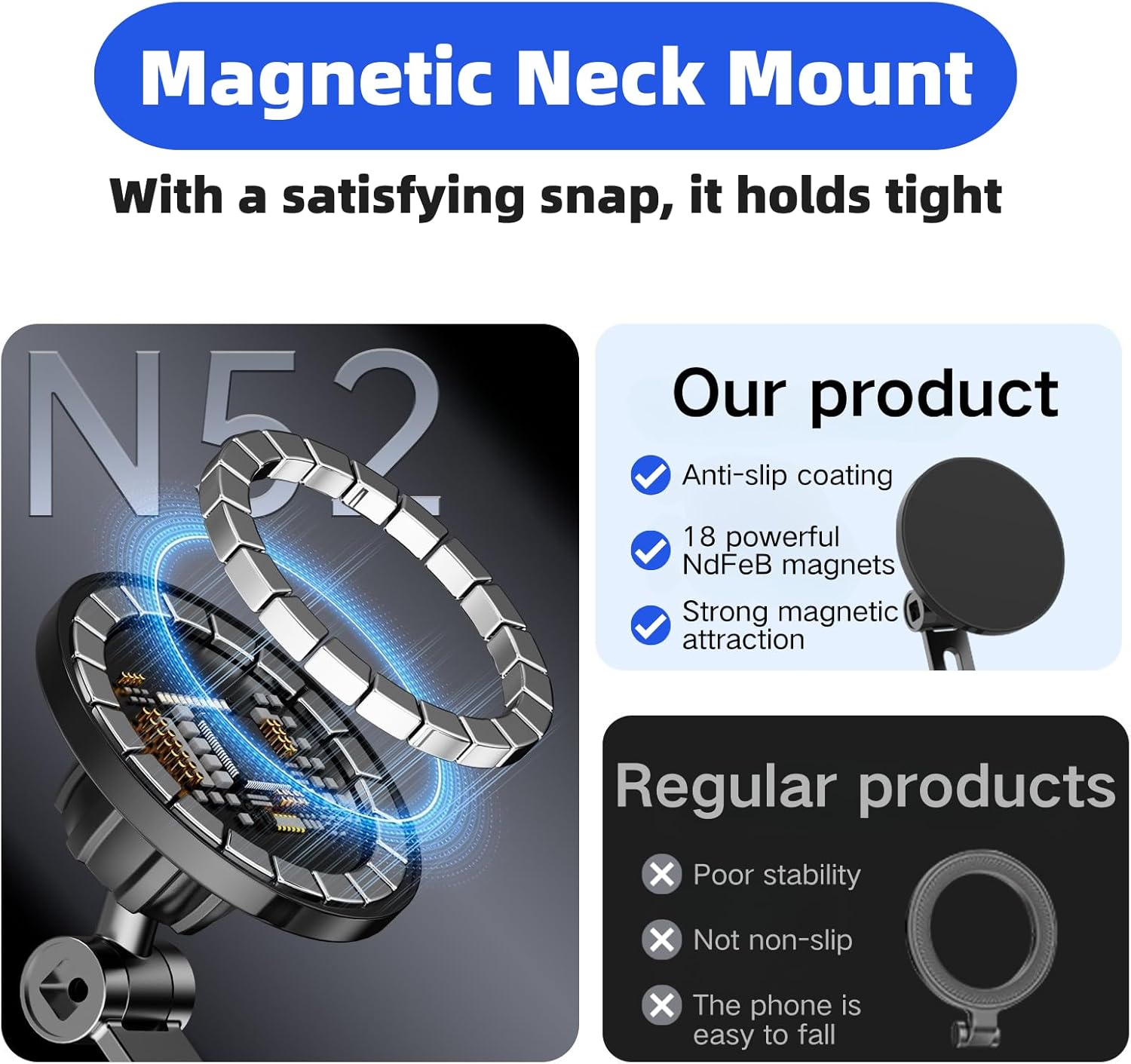 Magnetic Neck Phone Holder & POV Mount for iPhone Samsung GoPro DJI, Hands-Free Chest Strap Stand, Strong Magnet, Multi-Angle Adjustable for Vlog TikTok YouTube Content Creators