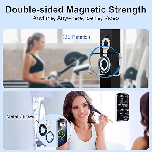 【Double Magnetic】The dual-folding, dual-magnetic design allows it to be directly attached to any magnetic car mount without the need for removal. The magsafe ring holder can be stuckto both metal and non-metal surfaces such as refrigerators, mirrors, walls, and gym equipment. stick the iron sheets (provided) on non-metallic surfaces. Free your hands for multitasking!