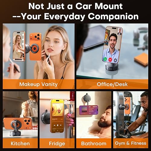 【Multi-Scene Application】Not limited to vehicles, this vacuum suction phone holder excels in various settings—be it the gym, kitchen, or bathroom. Its strong suction and magnetic capabilities make it a versatile magnetic phone mount for car and beyond. Ideal for content creators and everyday use, it's the ultimate magnetic phone holder for car.