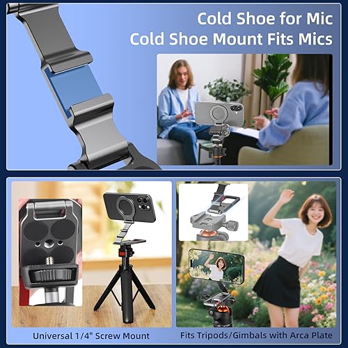 Tripod & Accessory Ready - This Mag Safe tripod adapter includes a standard 1/4"-20 screw hole, making it compatible with all 1/4" tripods, selfie sticks, mounts, and ring light stands. The cold shoe mount on the back easily attaches wireless microphones and other accessories, perfect for diverse shooting scenarios.
